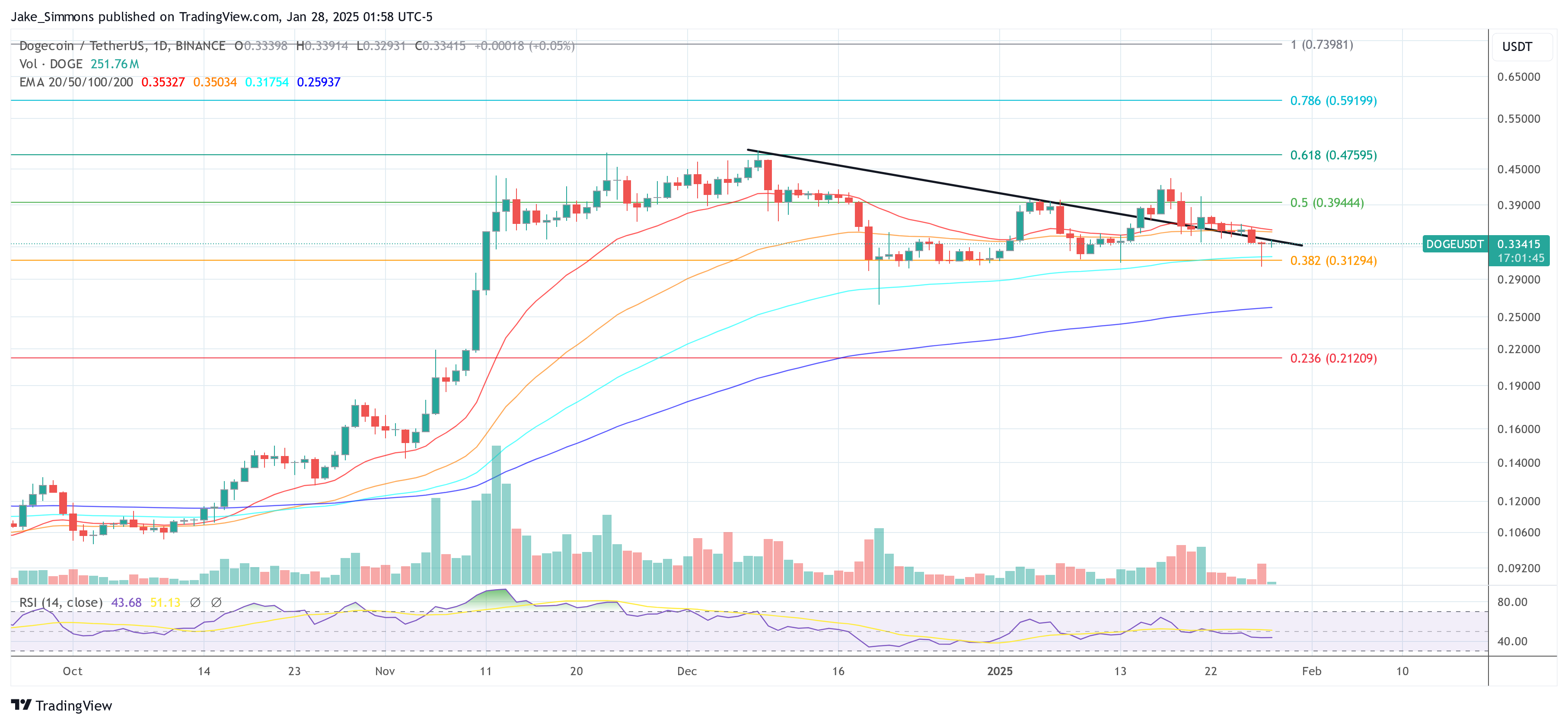 Martinez’s analysis of DOGE aligns with the broader technical picture, which suggests the token may be at a make-or-break juncture. Since December 8, when Dogecoin briefly surged to $0.4834, the price action has been defined by a descending trendline. Although DOGE broke above this line on January 15, 2025—indicating a potential bullish shift—broader market volatility on January 26 quickly dragged it back below.